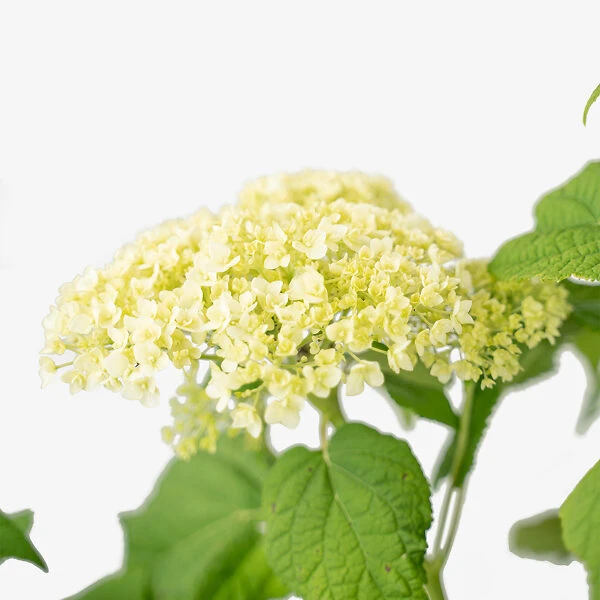 Annabelle is a mid-sized hydrangea, growing to a height of between 3 and 5 feet and a width of from 4 to 6 feet. A variety of the smooth hydrangea arborescens, this is relatively unusual among cultivated varieties as it’s derived from a native American species. In the wild it occurs from New York down to Florida, and west as far as Iowa, Oklahoma, Missouri and Louisiana. The plant has gray-brown stems and takes a looser form than most of the Asian species; this makes it very popular among gardeners who’re trying to create a more naturalistic look. The leaves can vary from rounded to egg-shaped and from two to six inches long; they are trimmed with sharp teeth, are dark green on top and pale on the underside.