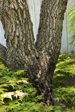 The Rough Barked Japanese Maple tree grows best in moist, well-drained soil, with plenty of organic material blended into it. Mulch over the root zone in spring with more organic material, to keep the roots moist and cool. It grows well in the dappled shade of larger deciduous trees, and this vigorous tree will reach 10 to 14 feet tall within the first 10 years of growth. As it develops, prune smaller branches from the trunks and main limbs, keeping the leafy branches clustered more towards their ends, to show off as much of the decorative bark as possible. This tree rarely suffers from pests or diseases, and it is easy to grow given the right soil conditions. It is not very drought resistant, and it should be watered regularly during drier periods. Note that the rough bark takes several years to develop on the trunk and branches, so young growth will be smooth.