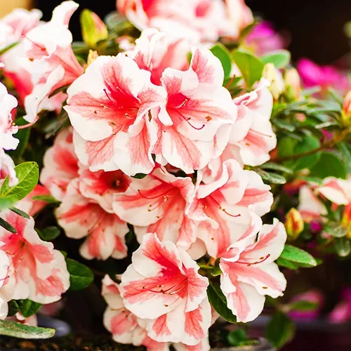 We have Robert E. Lee, a keen azalea lover and nurseryman from Independence, Louisiana, to thank for the Encore® azaleas. He began with a special plant called ‘Fourth of July’ he was given by a botanist called Dr. Thornton. He had grown it from the seeds of a rare plant called Rhododendron oldhamii, from Taiwan. In 1983 Mr Lee used pollen from this new plant on a cold-hardy azalea called ‘Shroeder’s Pink Perfection’, and grew the seeds. Starting with the seedlings he got from this cross he developed many different plants, all of them reblooming amazingly. One characteristic of azaleas is how a branch can suddenly grow with different flowers from the rest of the plant. These ‘branch sports’ gave him more varieties, including one called ‘Roblet’, or Autumn Sunburst. In 2016 Russell McConnell, from Loxley, Alabama, was growing ‘Roblet’ at his nursery, when he spotted another ‘branch sport’. That became ‘Robleze’ and was patented in 2020, joining the Encore azaleas as Autumn Starburst®.