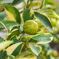 The Peach Sorbet Blueberry Bush is a compact evergreen shrub, growing just 18 to 24 inches tall and wide, with dense, leafy growth. The glossy leaves are oval, 1½ inches long, and the new leaves are colorful. They emerge the color of green bananas, with peach-colored tips, gradually darkening to orange-red, before maturing to a rich, mellow green. The leaves do not fall off for winter, but they do turn a handsome eggplant purple in fall, staying that way all winter, before the new leaves emerge again. You can expect a whole rainbow of colors over the seasons from this cheerful bush.
