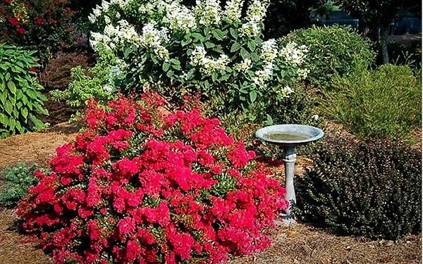 Because this is a dwarf shrub, if you are planting a group or lining a walk-way, space the plants 3 feet apart. It is important with Crepe Myrtles not to plant any deeper than the containers they are in and not to cover the roots with a lot of soil. Dig a hole three times wider than the pot, but no deeper. Place your plant in the hole, replace most of the soil and firm it well down. Then water thoroughly and replace the rest of the soil, being careful not to cover the roots with any extra soil. When planting in a pot or planter box, use a regular potting soil and be sure to water every few weeks with a water-soluble plant food for flowering plants.