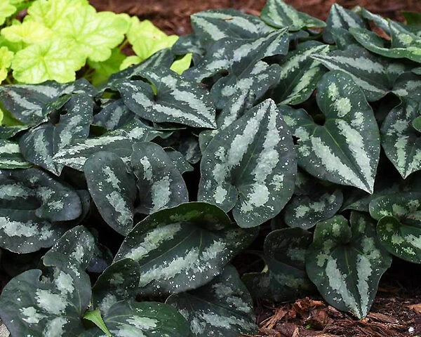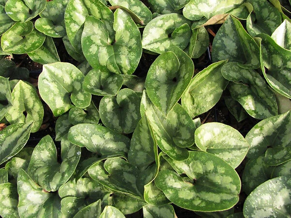 Chinese Wild Ginger, Asarum splendens, is one of the most attractive species of Asarum, a group of plants related to the climbing plants called Dutchman’s Pipe (Aristolochia). There are about 85 species, found in China, Asia, North America and Europe, but only a few are grown in gardens, and Asarum splendens is certainly, well, the most splendid of them all. It comes from western China, where it can be found growing on the floor of forests in Sichuan. Our resident plant experts suspect that the plant we are offering is actually the cultivar, ‘Quick Silver’, known for its more intense silver leaf patterns. However it wasn’t sold to us as that, so we can’t say for sure.