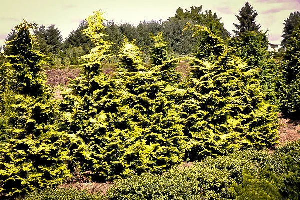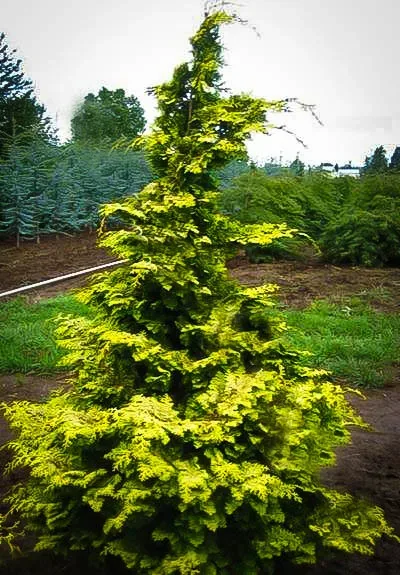 The Confucius Hinoki Cypress forms a small, bushy, upright tree that looks a little like the familiar White Cedar (Thuja). While the branches of Thuja grow with little pattern, on the Hinoki Cypress they form attractive fans and whorls, spreading outwards in an eye-catching way. This effect gives tons of character and charm to this tree. In the Confucius Hinoki Cypress there is the added beauty of golden leaves, so that each branch is green deeper inside the tree, and sparkling gold at the ends, giving incredible depth to the form of even a small specimen.