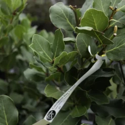 The leaves are evergreen, with a tough, leathery feel and a very distinctive and pleasant aroma, released even without crushing them. They can be used fresh or dried, and the older leaves have the strongest and best flavor. They are typically 3 to 4 inches long and 2 to 3 inches wide, more rounded in this variety than is seen in the wild tree. The color is mid to dark green, and the edges of the leaves are smooth, but with a wave-like undulation.