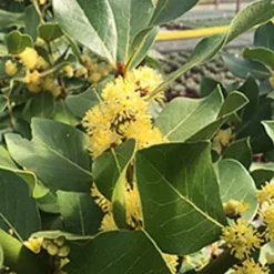 The Crestwood Bay Laurel is a selected form of this tree. It is a little smaller than a wild tree would be, the leaves are distinctly more rounded, and it also flowers much more reliably, with clusters of fragrant pale yellow flowers all along the stems in spring – best not to prune much if you want to enjoy them.
