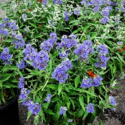 Color behaves in interesting ways in the garden. While white flowers look perfect in the shade, in the sun they almost disappear. Sunshine reduces the impact of other colors too, not just white, and dark reds are often disappointing from a distance. But blue is perfect in sunshine, standing out beautifully – just think of the blue sea and sky on that tropical island. So blue flowers are often the best choices for hot, sunny places, and for one of the richest and most striking blues available, look no further than the Dark Knight Caryopteris. The rich dark-blue flowers of this late-blooming shrub will shine out on the sunniest day, and you will love how it looks as a foreground in your beds, on slopes or scattered among boulders and gravel. One of the most versatile of low-shrubs, this is also one of the longest-blooming and if this plant is new to you, once you grow it you will see that it is indispensable.