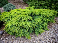 Unlike some other golden evergreens, Daub’s Frosted Juniper does not burn in full sun, and this plant thrives in open situations, even in cold zones. It is hardy everywhere, from zone 3 or 4 to zone 9. In zone 3 some winter burning of the young shoots is possible, but these are quickly replaced with fresh new growth in spring. The strong branches resist breakage from snow even in areas with heavy falls, and this tough plant is very easy to grow, and it is as resistant to heat as it is to cold.