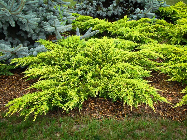 Daub’s Frosted Juniper is an outstanding color form of spreading juniper, with striking brilliant yellow new shoots, which gradually turn light lime green. For much of the year this creates a great contrast of yellow ‘frosting’ on a lime green plant, sparkling in the light and highlighting your planting arrangement. Besides color, this plant has beautiful form, with the branches arising from the center at about 30o and then having slightly pendulous tips. This creates a lovely, graceful look, and because it spreads wide, but stays at a lower height, this plant shows off in the foreground, without blocking plants behind it.