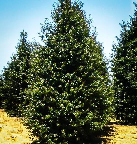 From a distance you might mistake this particular holly for an exceptionally perfect Christmas tree, but on closer inspection its lovely dense foliage is the instantly recognizable holly with its deeply spiked and glossy leaves. When bearing the bright red fruits in fall and winter it evokes childhood memories of every handmade Christmas card adored with springs of holly that you ever made for grandma and grandpa.