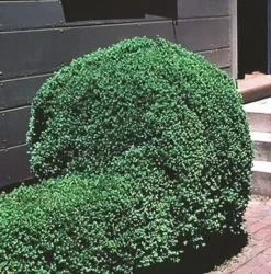 The Emerald Jewel Boxwood is a small evergreen shrub with a naturally mounding habit, growing between 2 and 3 feet tall and wide. It can be clipped in the traditional way, or left to grow naturally, when it will become a beautiful mound with a neat but slightly irregular outline. This modern way of growing boxwood is perfect for busy gardeners, and suits the more relaxed look of our modern gardens. The leaves are exceptionally small, generally no more than ½ inch long, with a leathery texture and a smooth, glossy surface. Rounded ovals, they are bright green when new, soon becoming a very rich, dark green. That color holds well through heat and cold, and doesn’t turn unattractive bronze tones in the winter months, even in cold zones. It rarely flowers, and the small, greenish-yellow blooms are insignificant, and often overlooked. Plants that are regularly trimmed almost never flower.