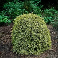 The Emerald Moon Boxwood will grow anywhere in zones 6 to 8. For warmer or colder zones, we recommend Japanese boxwood (Buxus microphylla var. japonica), which is more cold resistant, and more resistant to heat and humidity too. The Emerald Moon Boxwood is a variety of the American boxwood, which grows best in moderate climates, in both full sun and partial shade. It tolerates significant amounts of shade, but too much will make the growth weaker, thinner, and reduce the contrast of the variegation as well. The soil should be rich, moist and well-drained. Although established plants will tolerate some drought, plants do best with a good supply of water. The root system is shallow, so avoid digging or cultivating around you plant. Instead, mulch with organic materials to conserve moisture, keep the roots cool, and control weeds at the same time. Use an evergreen fertilizer in spring and again in mid-summer, to encourage vigorous growth, especially if you trim your plant regularly. Wait until the danger of frost has passed before beginning to trim in spring, and don’t trim during hot, dry weather, or after early fall, to avoid winter injury. Boxwood is easy to grow with a little attention, and although some pests and diseases are reported, plants that are fertilized, water regularly and trimmed once or twice a year normally stay free of major problems. Deer do not normally eat boxwood.