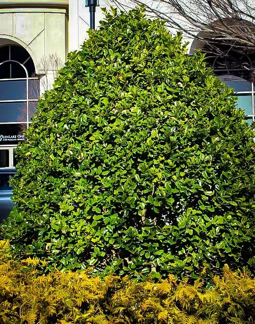 Unlike many other hollies, this one does not need a pollinator to produce a full crop of berries. The berries turn red by fall, and they persist through fall and into winter. they can be cut to decorate your home for the Christmas season, and who can resist the iconic look of those glossy leaves and red berries at that festive time?