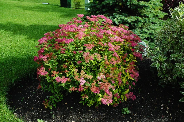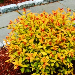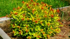 Use the Goldflame Spirea as a bright accent plant in the foreground of your beds, around your home or out in the garden. Plant it in clusters and drifts to fill larger spaces with weed-smothering easy-care bushes. Space the plants 2 to 2½ feet apart, scattering them, rather than planting in rows Use it among rocks with other small bushes, like blue trailing evergreens, or small upright plants. It is great for slopes and banks, as the stems and roots stabilize the soil and prevent erosion. Plant it in a row along the edge of a large bed, either in a lawn or against a driveway or terrace. Because it has such powerful foliage colors, this is a great plant for making low hedges, up to 2 feet tall. It clips well, soon re-sprouting with brightly colored leaves, and its an ever-changing bright feature you will love. Because the foliage is so colorful, this is one plant where you won’t mind losing the flowers when you trim. These colorful low hedges really brighten your garden, and they only need trimming a couple of times in the year.