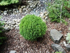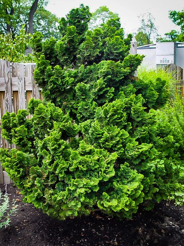 It often seems that the world of evergreen needle trees is divided into two groups – big trees like spruce and pine, and tiny dwarfs and spreading plants a couple of feet tall and often very slow growing. Sometimes we just want something in between – a medium-sized attractive evergreen for foundation planting and filling our beds with interesting plants. Luckily the Graceful Dwarf Hinoki Cypress fills this slot perfectly. This dwarf form of a Japanese native tree will grow at least 6 inches a year to reach 3 feet tall pretty quickly; eventually top 6 feet and finally mature around 10 feet tall and 4 to 6 feet wide. Throughout that time you will have a charming evergreen with rich-green foliage arranged in shell-like clusters, on a slender upright plant with foliage right to the ground.Â
