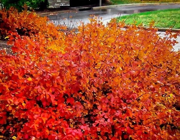 The Gro-Low Sumac forms a dense clump of intertwined branches, growing no more than 2 feet tall, and usually a little lower. Yet it spreads 6 to 8 feet wide, in a short time, growing at least 2 feet a year, so a few plants will fill a large space with top-quality ground cover. The slender branches are smooth and gray, and if you crush one, or the leaves, it releases a beautiful resinous, lemony fragrance. The branches are densely clothed in small leaves, each divided into three leaflets with wavy edges. They look a little like large three-leaf clovers, but the leaf is leathery, glossy and a rich green color. The leaflets can be as much as 3 inches long and 1½ inches wide, but they are usually smaller, often no more than 1½ inches long. The deep green leaves make a lovely neutral backdrop to your shrubs in spring and summer, but in fall they step out onto center stage. They take on a brilliant shade of purple-red, highlighted by flashes of orange and yellow. This spectacular show develops later than most other trees, but it is worth waiting for. In spring small clusters of yellow flowers form on the tips of the branches, adding an attractive touch, and increasing the value of this plant.