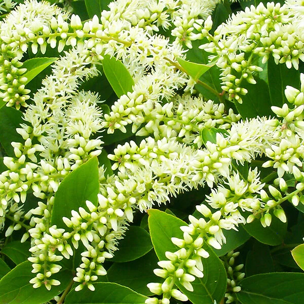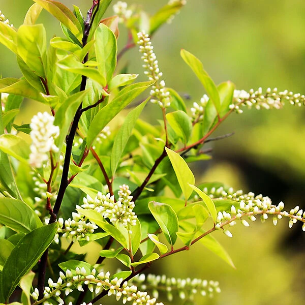 Henry’s Garnet Itea is a deciduous shrub growing 3 to 4 feet tall and up to 6 feet wide. It has a dense, bushy form with slightly arching branches. The leaves are smooth ovals, between 1 and 4 inches long, and a warm green color. In fall they turn beautiful glowing shades of golden yellows, oranges, and deep burgundy-reds. In their fall colors the leaves remain on the plant for weeks, often well into the winter months, continuing to provide interest in your garden. Flowering is in late spring and early summer, with long flower heads developing at the ends of the new shoots. Each spike is 4 to 6 inches long, and packed with many small, star-shaped white flowers. These open from the base of the spike upwards over several weeks, giving a long and profuse bloom period, with the plant smothered in arching flower spikes. The flowers are sweetly fragrant and attract butterflies and pollinating insects. They are followed by insignificant seed capsules.