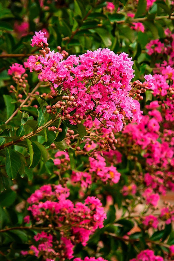 Drought-resistance and tolerance of hot, sunny places; more than 4 months of continuous bright-pink blooms; a medium sized shrub that will fit in all but the smallest of gardens; easy-care, plus pest and disease resistant – what’s not to like about the Hopi Crape Myrtle? Crape myrtles are tough shrubs with an established reputation for easy care and consistent flowering, which as made them the backbone of many gardens in warmer areas. The Hopi Crape Myrtle is among the pick of the bunch, having been bred to resist the mildew disease that disfigures most traditional varieties. Not only that, it is more resistant to cold than almost any other variety, so for this shrub zone 6 is a breeze, and even in zone 5 it will survive with a little care, and quickly recover from winter damage.