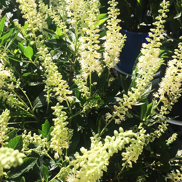 Flowering begins in the second half of summer, and continues for several weeks. The new stems that sprouted in the spring grow a long cluster of many tiny white flowers. These spikes are up to 6 inches long, and the blooms open gradually from the bottom, so blooming lasts up to 6 weeks, at a time when it can be hard to find plants in bloom. The tiny, fluffy blossoms have a striking scent which some people say reminds them of licorice, and they attract butterflies like magnets, plus bees and hummingbirds too. When they fade they are replaced by round, dark-brown to dark-gray seed pods, which make an interesting display through the winter months. These seed pods look like peppercorns, giving this plant the alternative name of pepper bush, but they don’t have any particular flavor.