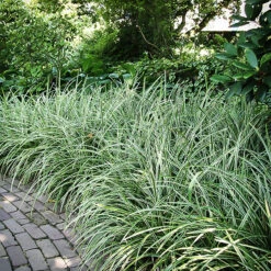 You can build wonderful landscapes with shrubs – it’s what we specialize in – but adding a little more can make a big difference. Filling in the low spaces around the edges of your beds, beneath trees and along your pathways, adds a whole extra dimension to the look of your garden, and a richness and sense of completeness. You could do it with annual flowers, but just think of the work! Instead, do it with low-growing, evergreen perennial plants. The ones that grow in full shade are especially useful, and that is where you can find the Ice Dance Sedge bringing its brightness to lighten the darkest corners with its slender green and white leaves. It will do the same in partial shade and full sun too, spreading slowly without taking over, and making a sparking carpet of white and green that always looks great.