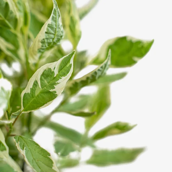 The Ivory Halo Dogwood is a deciduous shrub that grows 5 to 6 feet tall and wide, making an excellent medium-sized plant for a larger garden, or a background plant in a smaller garden. It has a twiggy structure, with multiple branches coming from ground level. In spring and summer the foliage is delightful, with each light-green leaf having a broad, irregular margin of white, creating a plant that brightens up all parts of your garden. It looks terrific standing out against a hedge or other plain green plants. Plant it singly or in groups among evergreens around your home, or in shrub beds. Create an informal edging along a path or driveway with a row, spacing the plants 4 feet apart. Use it in large planter boxes to brighten paved courtyards in urban areas. No matter how you use it, this plant is sure to please. For a striking winter effect, mix this shrub with the Yellow Twig Dogwood, (Cornus sericea ‘Flaviramea’), whose bright yellow winter twigs look great mixed with the red twigs of the Ivory Halo Dogwood.
