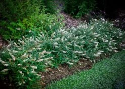 The Lo & Behold Ice Chip Butterfly Bush is a broad deciduous bush, reaching between 1½ and 2 feet in height, and spreading well over 2 feet across. It has many sturdy stems, forming a full plant, covered with long, narrow leaves. These are around 4 inches long and a little over one inch wide, tapering to a narrow tip. They are an attractive gray-green color, and they make a perfect backdrop to the beautiful white flowers. The flowers are tiny, but they are gathered into upright cones with about 100 flowers in each one. Each blossom head is 3 inches long, tapering from a base over 2 inches across, forming a fat cone. The flowers have a sweet fragrance, and they attract butterflies, other pollinating insects, and hummingbirds as well, and these visitors make this bush a great attraction in your garden, especially for children.