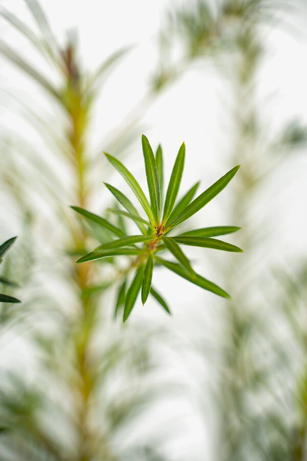 The Maki Podcarpus is a special, dwarf version of the Buddhist Pine, also known as Southern pine or plum yew pine, or Podocarpus macrophyllus. Slightly related to, but different from, yew trees, this plant grows naturally in China and Japan, and it has been used for centuries for hedges and screening there, as well as in temple courtyards and home gardens. There seem to be at least five different variations in this tree, and the variety maki is the one most commonly grown in Europe and America. Some scientists just consider them to be variable forms of the same plant, but other varieties grow much taller and have longer needles, up to 5 inches long, which are also broader. Whatever the differences, the Maki variety is the best for garden and indoor use, so avoid plants just called Podocarpus, as these may grow much larger, and lack the attractive columnar shape of the real tree.