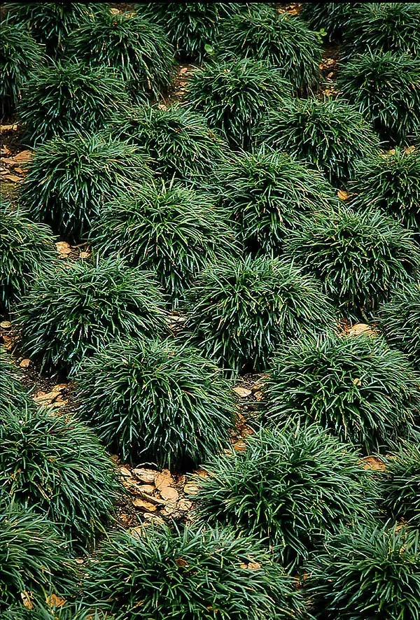 Mondo Grass, Ophiopogon japonicus, grows naturally in woodlands and beneath trees in Japan. It has been used for centuries in their gardens, and probably came to America in the 19th century, when so many Japanese plants were introduced. Our plants are grown by division of superior, healthy forms and they will quickly establish and become dense clumps of this attractive plant. The trends of ground-cover plants, Japanese gardens and container gardening all come together in this versatile and useful plant, so the demand is always high. Order now while our top-quality plants are still in stock.
