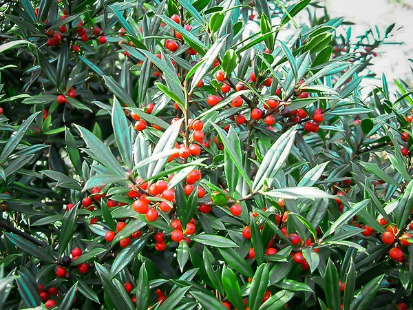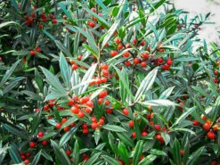 A holly tree to most people means spiny leaves and red berries, but the Nasa Holly is very different, and it will often bring out the ‘what is that?’ question. This handsome dwarf shrub has narrow, glossy leaves without spines, although the red berries in winter will probably give its true nature away. It is a handsome evergreen bush for a smaller garden or smaller area, or to use in planter boxes and pots. Nasa Holly is slow-growing, forming a narrow, upright pyramid that may eventually reach as much as 10 feet, but will usually be half that in height. Its narrow form makes it great for filling small corners, or to plant in partial shade among other evergreens. It always looks great, and the leaves keep their rich olive-green color all year round.