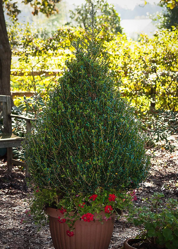 A special form of the popular and tough Japanese holly, the Patti O Boxâ„¢ Holly is a narrow, upright plant with very small, rich-green leaves packed closely on a dense, upright bush. It grows just 3 or 4 feet tall, and it is only a foot or two wide at the base, with a narrow pyramidal form. The small leaves are perfectly scaled for this small plant, which will always look neat and perfect, growing in a bed with other small shrubs as an upright accent, or in boxes to stand beside a doorway or gateway, or on the corners of a small terrace. You can grow it alone for a simple, elegant look, or plant annual flowers around it. You can also use this great plant in larger boxes, with other, lower plants, such as Encore Azaleas for example, to give flowers over months and months. Create a tiny hedge at the back of a bed, or along a narrow pathway.