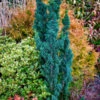 For the rest of us it’s a terrific choice. The Pencil Point Juniper forms a very tight column of blue-green foliage that grows one to six inches a year to a height of less than 5 feet in 10 years. At that height it will be less than a foot wide. All this with no clipping at all, yet it always looks like you have just finished giving it the perfect trimming. It will continue to grow slowly, adding an inch or two a year, while staying very dense, and very narrow. In late fall and winter, the foliage may turn a coppery-bronze color, adding winter interest. In spring the foliage will return to its normal blue-green tones. Older trees may occasionally produce small black cones called juniper berries, which are used to give gin its characteristic flavor.
