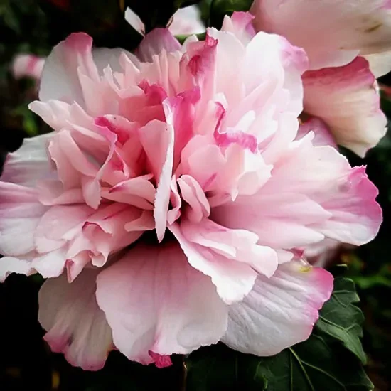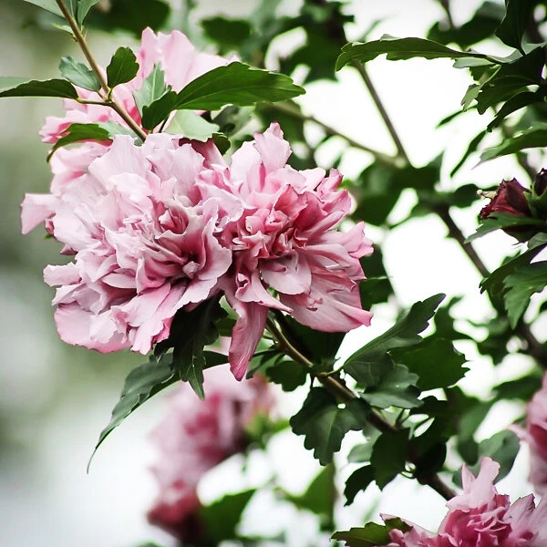 Of course, it is the flowers we are here for, and what gorgeous flowers they are. 4 inches across, each bloom is a party-dress of ruffles and frills, with a full, rounded form made up of many petals, each one folded and ruffled along the edges. The basic color is clear, light and pretty pink, but in the heart of the bloom is a rich red center. That red color peeks out from among the petals, sometimes running along the veins. The background pink is highlighted by splashes and streaks of a darker pink, and each flower is subtly different from the next one. Blooming begins in June in warmer zones, and by July everywhere else. Each bloom lasts 2 or 3 days, but it is replaced by more and more, as the buds just keep on coming. This bush is sterile, so no seed-pods are produced. This means all the plant’s energy goes into making more blooms, and none of it is wasted on seed production. That also keeps it blooming and blooming, week after week and right into fall. Often it takes a hard frost to finally end the show.