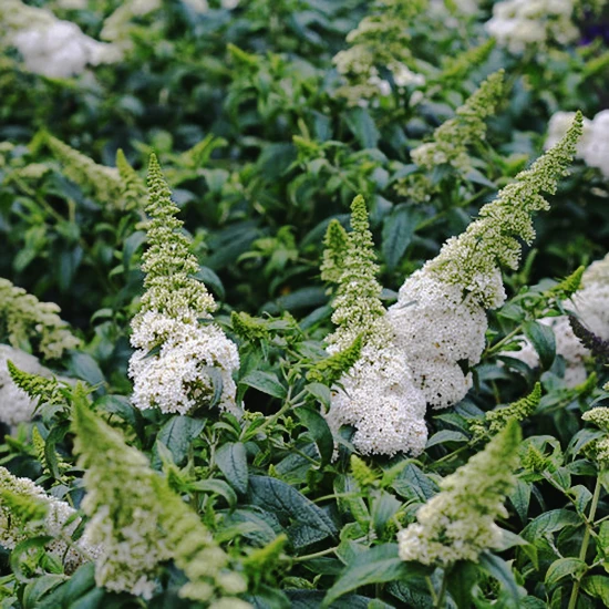 If you want the combination of big white blooms on a compact bush, look no further than the Pugster® White Butterfly Bush. Like a short but sturdy pug dog, and just as cute, it grows only 2 feet wide, with an arching spread. The flower spikes are an enormous 13 inches long, and they keep on coming and coming from early summer right through fall to the first frost. This great little plant will be top dog in your garden.