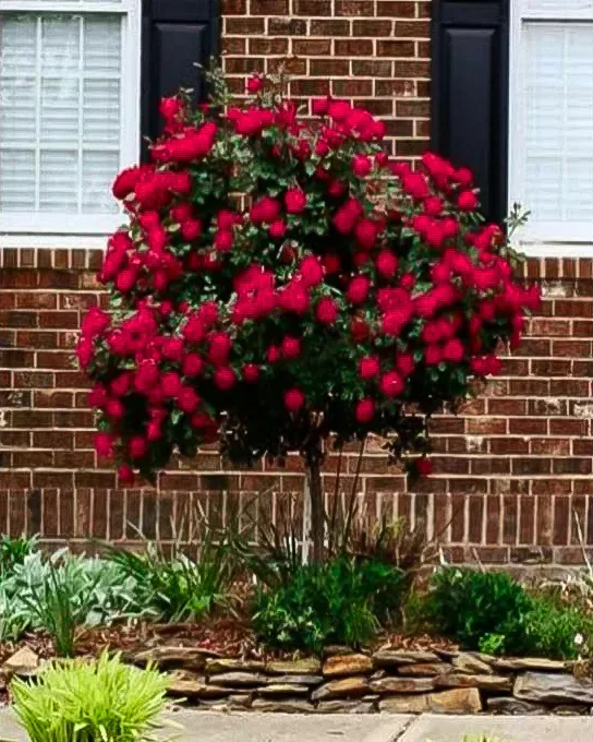 There are many uses in the garden for the Double Red Knockout Rose Tree. In a smaller space, or a narrow bed, we often need some height without a lot of width, and almost all flowering shrubs are rounded, so a 6-foot shrub is generally 6 feet wide, or even more. The beauty of using this Rose Tree is that it is still only 3 or maybe 4 feet wide across the crown. It takes up so little room, and yet it brings those wonderful blooms right up where you can see them perfectly. Imagine a row of these plants lining a walkway, or that narrow space between a driveway and fence, that so many gardens have. It is also perfect for planters and large boxes, where you can plant smaller shrubs or flowers underneath for two levels of color for months. Indeed, take a look at our Drift Roses – they would grow perfectly beneath these rose trees and make a stunning floral display for months and months. Rose Trees also look great among other flowering and evergreen shrubs, in the middle part of a larger bed, with smaller shrubs in front, and larger ones behind.