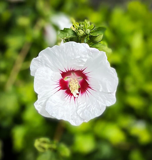 The blooms are carried all along the stems. Each one opens for a day, but the clusters keep on coming and coming, so blooming lasts for many weeks. In zones 8 and 9 bushes may be in bloom by June, but in cooler zones flowering usually begins by August, and continues through the fall, unabated, until stopped by a hard frost. Round seed pods form after blooming. Each bloom is 4 to 6 inches across, like an open trumpet, with 5 pure-white petals. At the base of each petal is a deep-red blotch, radiating up the petal in thin lines along the veins. This creates a red heart to the bloom, a look which is simply ravishing.