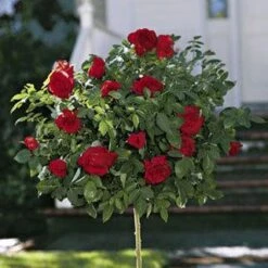 Maintenance of the red Knockout Rose Tree is simple. Because of its form, the main stem doesn’t need pruning, but the branches can be cut back hard in late winter to promote vigorous new growth. Fertilize in the first year, but after that it’s enough to water regularly in hot weather. The variety is quite drought-tolerant, but if the leaves start to lose their gloss it could do with a drink. It’s also a highly disease-resistant species and while all the common rose disease may make an appearance it’s not at all likely. A periodic check for aphids, borers, scale and thrips is a good idea, though.