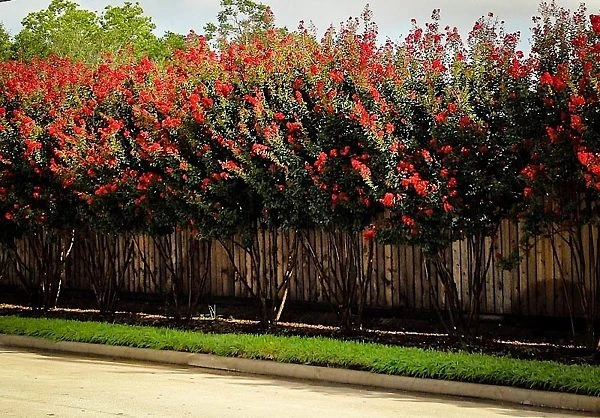 Red Rocket is more upright than many crape myrtles, so when planting a screen they should be planted 4 feet apart. It is important when planting crepe myrtles not to plant any deeper than the containers they are in and not to cover the roots with a lot of soil. So dig a hole or a trench two or three times wider than the pot, but no deeper. Place your plants in the hole, replace most of the soil and firm it well down. Then water thoroughly and replace the rest of the soil, being careful not to cover the roots with any extra soil.