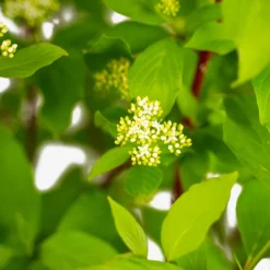 Although the plants can be left un-pruned, to get the most colorful twigs and to control the size it is usual to prune the Red Twig Dogwood regularly. There are two methods used. Each spring remove about 25% of the branches at ground level, to encourage new, more brightly colored shoots. Alternatively, you can choose to cut the whole plant back to a few inches tall every second or third year. Only use this method with strongly-growing plants or the plants will weaken over the years. This method does give the best twig display. Plants that are regularly pruned flower less, but the flowers are not an important feature of this plant.