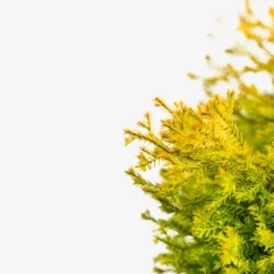 The Rheingold Arborvitae develops into a rounded form, just a little taller than wide, reaching 3 to 5 feet in 10 years, and just a little less across. Like all conifer evergreens it continues to grow for its whole life, and older plants will become significantly larger, although they can easily be clipped to keep them smaller and neater, if you wish. The most striking feature of this plant is the vibrant golden color of the leaves. Some ‘golden’ evergreens are just gold on the new leaves, but this beauty is gold all the way through, and stays that way all year round. No other evergreen maintains its golden color so well, in winter and in summer, so it is no wonder that this old variety has remained a top favorite for so long. Summer foliage is bright yellow, and in winter, with colder weather, a coppery ‘old gold’ color develops.