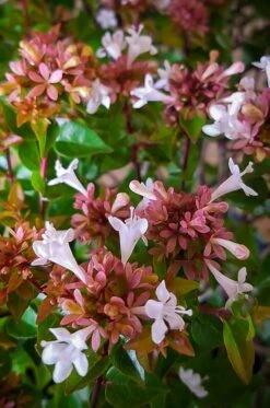 Grow the Rose Creek Abelia in full sun or partial shade, with the most flowering seen on plants in full sun. It grows best in moist, well-drained soil, although plants have good drought tolerance once established, and pass unharmed through hot, dry spells. Moist and rich soil will produce the lushest growth and most flowers. This plant is very easy to grow, thriving almost anywhere, and needing no special care at all. Pests and diseases almost never cause problems. In colder zones the stems may be killed back by the winter, but it quickly re-establishes itself, and since flowers form on new shoots, it will still bloom magnificently. Removing older twiggy stems and pruning the rest back by one-third in late winter or early spring will keep your plants bushy, attractive and blooming profusely.