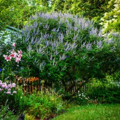 We don’t hear the word chaste used much anymore, in these liberal times, and anyway, you could hardly describe the abundant flowering of this tree as ‘chaste’. It is one of those plants that has no relatives in our gardens, but with its outstanding beauty it shouldn’t be ignored, but grown wherever it can be. Flowering late in the summer, it is just what our hearts need at that time – a fresh brightness in the garden, and blue is especially valuable, and always rare. In fact, there are very few blue-flowering shrubs at all, so that is another reason to choose the Shoal Creek Chaste Tree, a fabulous sight when in bloom, with its foot-long clusters of bright blue-violet flowers at the ends of branches. This spectacular shrub is rarely seen in most areas, yet it is easy to grow and its strange absence from our gardens is something you can easily set right.