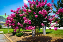 The Sioux Crape Myrtle grows between 15 and 20 feet tall and has a narrow, upright form, making it ideal for smaller gardens. The crown is rounded and oval in shape, on an upright trunk. The blossoms are an attractive mid-pink – a softer color than many other Crape Myrtles, The summer foliage is glossy and a rich, dark green color, free of the disfiguring white growth of powdery mildew.