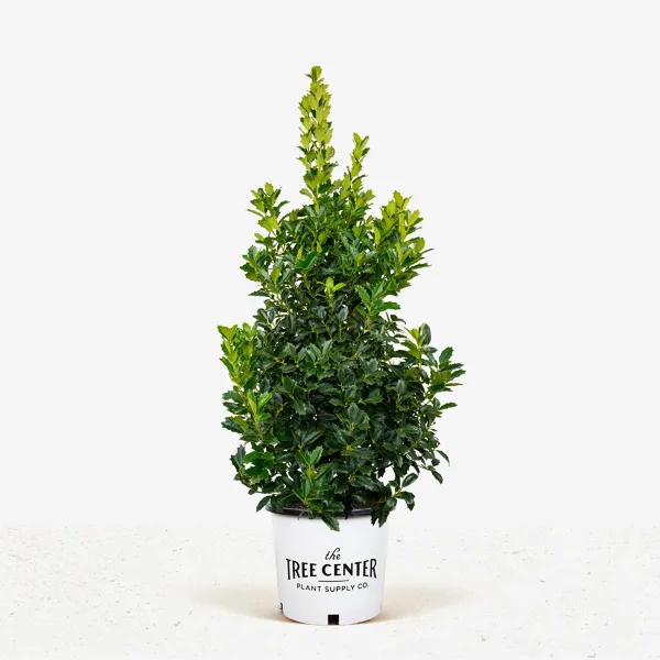 The Oakland Holly Tree is however not just some novelty item. Besides being unique, this bush is a real garden ‘work-horse’. It is a vigorous grower, adding 12 inches or more a year until it reaches 15 or even 20 feet in height. It develops naturally into a dense pyramid, with solid branches from top to bottom, so it makes a great barrier or screening plant. With a mature width of at least 12 feet, you don’t need many trees to create a solid, evergreen barrier that will always look great and not even need trimming. Plant your trees 4 to 5 feet apart in a row and you will soon have a solid wall of rich green, giving you the privacy you need, hiding an ugly wall or view, or making a perfect neutral background to your flowering shrubs.