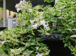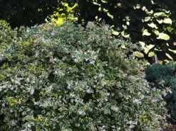 The Twist of Lime Abelia is a dense, rounded, evergreen shrub with many arching branches, rising to a height of 4 or 5 feet, with a similar spread. It can be trimmed into a smaller bush, or into a hedge. The slender stems are covered all along their length with pairs of small leaves, about 1½ inches long, and oval, tapering to a point. The leaves are smooth, glossy and always attractive, and evergreen except in zone 6, where some may drop during mid-winter. The leaves are rich green, but with a wide, irregular, colored edge along both sides. On new shoots in spring the edge is buttery yellow, and as summer comes its turns a cream-tinted white. Then in fall the edges become pink and the green becomes bronzy, giving the bush an attractive look for the winter. Unlike some other variegated Abelia, this one is stable, and doesn’t keep producing stems with plain green leaves.
