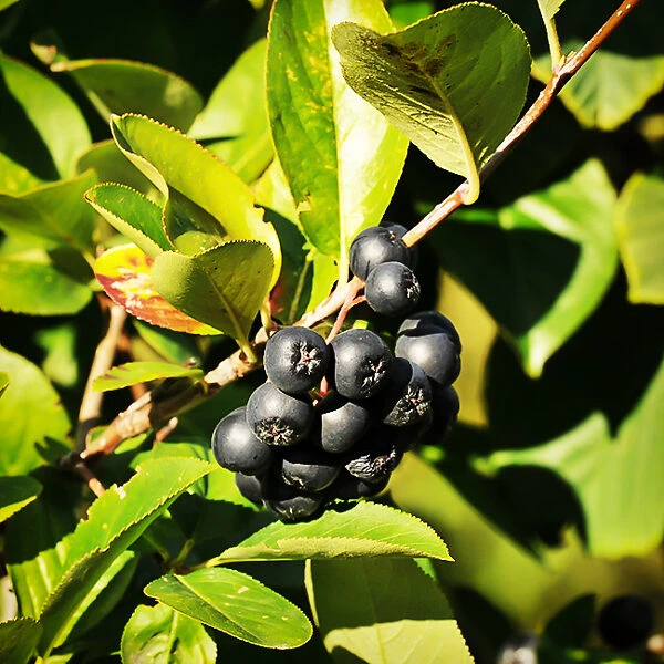 In spring clusters of white or pale-pink flowers form, in groups of 5 or 6. These simple flowers have 5 flat petals, and they are slightly fragrant. A bush in bloom is an attractive feature in any garden. Each flower develops into a berry, which by late summer hang in bunches. They are a little larger than cultivated blueberries, and they are glossy, and a dark purple-black color. The flesh is red, and they look a little like miniature cherries. The berries are very astringent when raw – hence the name ‘chokeberry’ – but once turned into juice and jelly they are very valuable in the kitchen. The fruit is very high in vitamin C, and it contains a wide range of polyphenols and anthocyanins. The juice is often mixed with apple juice to sweeten it naturally. Fruit is usually ready for harvest from late August until the end of September.