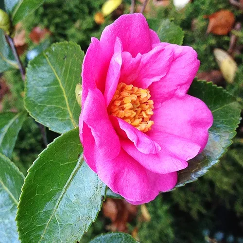 The Winter’s Joy Camellia is an upright evergreen bush growing at a moderate pace to around 6 feet high and 4 feet wide. It is dense and bushy, with compact growth and a few longer, more arching stems. The leaves are leathery, dark-green and glossy, a bit more than 2 inches long and an inch wide, with a pointed tip and serrated edges. Flower buds develop over the summer months, mostly at the ends of the branches, singly or in clusters. The first blooms often open in October, and the flowers open in succession, meaning that blooming continues for months, certainly into December and often into January as well. That’s flowers for 3 or 4 months, at a time when nothing else will be flowering in your garden. The medium-sized blooms have about 18 fluted petals, and measure a full 3½ inches across. The petals are a beautiful medium-pink, clear and bright, surrounding a central brush of bright yellow stamens. A glorious bloom, and needing no dead-heading, since the flowers drop naturally as they finish, keeping the bush always fresh and lovely.